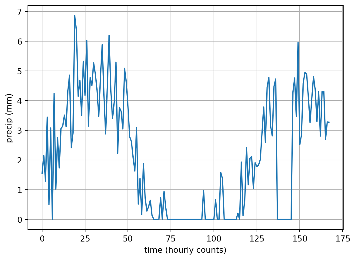 import numpy as npimport matplotlib.pyplot as plt# create a "time" vector of hourly counts over 7 dayst = np.arange(24*7)# create random "outage" time and noiset_outage = np.random.randint(140, 160, 1)precip_noise = np.random.normal(1.5, 1, t.size)# create a precipitation pattern with a sine wave and superposed noiseprecip =3*np.sin(t/(6*np.pi)) + precip_noise# set all negative precip to zero and create "precipitation gauge outage"precip[precip <0] =0precip[(t > t_outage-5) & (t < t_outage+5)] =0