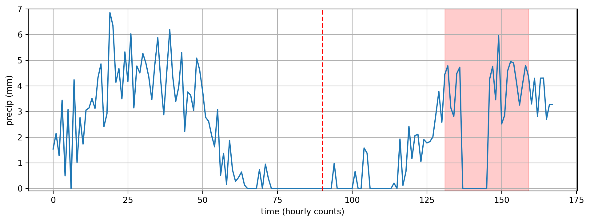 When you’re done with steps 4 and 5, edit the following code cell to adjust the plot, so that the red vertical line and red shading match the correct times based on the calculations of your functions. To do that replace the hardcoded values in the first two lines with your function calls. If you re-run the first code cell where precip is generated, you will get slightly different times. If you then run the following code cell again, you will see whether your functions pick up on the changed data set and still return the correct result. If they don’t return the correct result, try to assess whether our underlying rules and assumptions are too crude or whether there is a bug in your function.